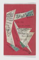 artist's book: pen and black and blue ink, collage of hair and printed clippings, red paper cover, stapled binding