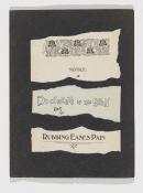 artist's book: pen and ink, collage of printed clippings, postcards, found handwritten notes, black paper cover, stapled binding