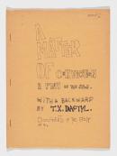 artist's book: black and red typewriter text, pen and ink, printed book page, yellow paper cover, stapled binding