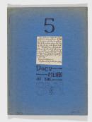 artist's book: pen and ink, collage of printed and handwritten cards, found handwritten notes, pressed flowers, fabric, and printed clippings, blue paper cover, stapled binding