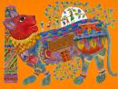 The enormous multicoloured cat here is Mārjāra, the vahana (vehicle) of the Hindu folk goddess Shashthi. Shashthi is venerated as the protector of children and is evoked during birth to protect mother and child. Mārjāra is worshipped on the sixth day of the month and on the sixth day of a child’s life, when it is believed Mārjāra visits the mother and newborn to bless them. She is also the deity of fertility, and is prayed to by people unable to conceive, as well as farmers wishing for fertile earth for their crops. The Gond people are one of India’s largest indigenous groups, living in the central state of Madhya Pradesh and its surrounding regions.