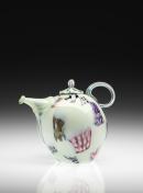 Murrini on white ground, bulbous teapot, milky white body, surface millefiori-type coloured patches.
