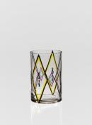 Cylindrical, decorated black, mauve, gold, green enamels with alternating large and small lozenges
