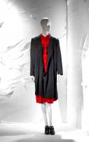 (b) Red shirt dress with small collar, short sleeves, open under the arms, gathered gently from under the bustline. The dress features black crochet detail across chest and upper back and fastens with ten buttons down centre front to finished at the knee.