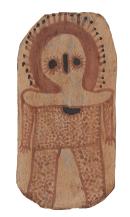 A Wandjina is shown, inspired by figures found in cave paintings of the Kimberley. The lines coming from the hairdress symbolize clouds. The body markings indicate o:nmal (white ochre painting).