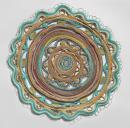 A place to share represents a place of coming together. The work was inspired by First Nations women coming together to connect and create, often sitting in a circle to share culture and knowledge. The weaving was influenced by an overseas trip that the artist took to Bougainville, as part of the Women’s Wealth Project in 2018–19. For this project, Carmichael brought with her the traditional weaving fibre from Quandamooka Country, ungaire (swamp reed), which is woven throughout the work together with the contemporary materials of raffia, wool and yarn. She was gifted a 142 piece of noni (dyed pandanus) from Bougainville, the maroon material that forms the inner circle.