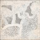 Wintjiya Napaltjarri was a Pintupi artist known for painting her father’s ancestral Country near Kintore, about 500 kilometres west of Mparntwe/Alice Springs in the Northern Territory. The daughter of renowned painter Shorty Lungkata Tjungurrayi, she grew up travelling her Country in the Gibson Desert, immersed in cultural knowledge. As part of the second generation of painters at Papunya, Napaltjarri developed a graphic style that was often characterised by her stripped-back palette. Here we see her skillful application of white to trace seasonal and climactic changes across Country, offering a sense of intense, storming wind and hail.