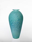 Tall vase with narrow mouth and everted rim, tapering towards the base; with blue and ochre scale pattern.