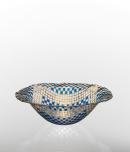 Slumped bowl with round base and broad, wavy rim; the whole decorated with a regular grid executed in deep blue and gold.