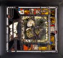 Rectangular, heavily-leaded panel set in a dark stained wood frame; a central area with three organic, laminated shapes surrounded by polychrome strips: the whole with areas of staining and brushwork and elaborately textured lead divisions.