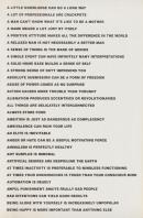 Jenny Holzer conceived of Truisms while she was enrolled in the Whitney Museum of American Art’s independent study program. Faced with a vast reading list of canonical literature, Holzer distilled the texts into single-sentence declarations, which she later organised into alphabetised lists. Presented side by side without context, each of these so-called statements of fact are revealed to be merely one of many possible perspectives. When Truisms was first displayed as anonymous street posters in New York from 1977 to 1979, members of the public responded by suggesting revisions or crossing out sentences they disagreed with. Since then, Truisms has been presented in various formats, including kinetic LED signs and t-shirts. In each iteration, the series transforms an everyday encounter with language into an opportunity for critical reflection or debate.