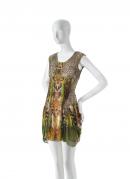 silk (chiffon, organza), leather (suede), synthetic fibre, silk (satin), plastic (boning), metal (fastenings), plastic (buttons)