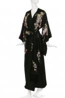 During the late nineteenth century, silk and embroidered silk garments became major Japanese export commodities. The broader awareness of these kimono-style garments coincided with shifting notions of femininity, form and comfort in European women’s fashion. Responding to the concurrent Japan-influenced Japonisme movement in European art and design, Japanese textile workshops began to subtly adapt garments to suit the tastes of the Western market. These silk and embroided Japanese export garments are broadly based on traditional kimono. They are designed to be loosely worn and secured with an easy-to-tie tasselled waist sash in place of an obi sash.