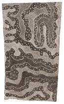 printed (vertically) in ink and inscribed in fibre-tipped pen on paper label on reverse u.r.: ● BUKU-LARRAŊGAY MULKA ● / (two figures) (in a circle) / YIRRKALA N.T. (all in a circle) Artists NAMINAPU / Description / CatNo 2628-20 Price