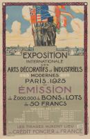 This poster by French designer Henry Rapin advertises the issue of two million bonds in support of the 1925 International Exhibition of Decorative Arts and Modern Industry. Interested parties could lend money in the form of bonds via Crédit Foncier de France to help the French government fund the exhibition. In exchange, they were offered a range of financial incentives. The poster shows artisans from various countries bearing aloft their nations’ flags. While the United States is represented, it ultimately declined to participate in the exhibition.
