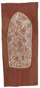 Mulkun Wirrpanda’s work is rooted in her knowledge of edible plants and natural species found throughout Arnhem Land. These are four of Mulkun’s last bark paintings, made in 2020 just before her passing. The subject is the gundirr (magnetic termite mounds) that are home to munyukuluŋu (magnetic termites) and ŋadi (meat ants). Mulkun has removed all background crosshatching so that the termite mound is highlighted within a sheet of negative space. Poignantly, ŋadi are a talisman of the artist’s sacred identity and are associated with mourning ceremonies for the deceased.