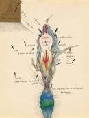 Mimi Parent was a Canadian Surrealist who worked in various media, including drawing, painting and sculpture. She studied at the École des Beaux-Arts in Montreal from 1942 until 1947, but was expelled after joining the controversial artists’ group Prisme d’yeux (Prism of Eyes). Parent worked in Paris for many years alongside her husband and fellow artist Jean Benoît, and became a member of the Paris Surrealist Group in 1959. In this watercolour she integrates text into a Surrealist composition with collage and mixed media.