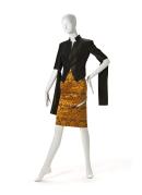 (b) label, centre back waistline, woven in bronze on black synthetic fabric: ALEXANDER MCQUEEN