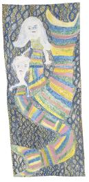 Using a combination of natural earth pigments and reclaimed toner ink (ground polyester) from discarded printer cartridges, in this work Djerrkŋu recalls a mermaid dream that her father had while her mother was pregnant with her. The painting tells the story of the artist’s conception as a spiritual mermaid. Stories about mermaids appear in myths around the world, but the Yolŋu mermaid, which appears in both freshwater and saltwater, is lesser known.