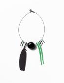 black glass pod, green 3D printed echidna quill on steel thread, 3D printed crow feather, green dyed echidna quills