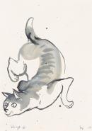 This drawing is a preparatory sketch of a very large cat that appears in Ben Quilty’s 150 year, Rorschach, 2019, a seven-panel panoramic landscape painting that is in the NGV Collection. Quilty has modelled and styled the cat after Japanese ukiyo-e prints and drawings. Directly translating in English as ‘paintings of the floating world’, ukiyo-e is a type of Japanese woodblock printing that speaks to the transitory nature of life. Such prints became exceedingly popular during the Edo period. Quilty’s reference to the medium in this work reinforces the spiritual and otherworldly quality of the painting.