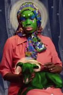 In this self-portrait, Melbourne-based artist Atong Atem subverts the longstanding tradition of aristocratic women posing with their lapdogs. While similarities can be drawn between the composition of Atem’s work and others in this section of the exhibition, Atem’s works challenge entrenched ideas of status as opposed to celebrating them. Posing with an Italian greyhound named Rooster, Atem, her face painted green, challenges Western beauty standards and what is considered ‘normal’.
