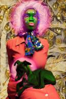 In this self-portrait, Melbourne-based artist Atong Atem subverts the longstanding tradition of aristocratic women posing with their lapdogs. While similarities can be drawn between the composition of Atem’s work and others in this section of the exhibition, Atem’s works challenge entrenched ideas of status as opposed to celebrating them. Posing with an Italian greyhound named Rooster, Atem, her face painted green, challenges Western beauty standards and what is considered ‘normal’.