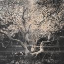 This intricately detailed image is of a grey mangrove tree on the Hawkesbury River, NSW. Joshua Yeldham has made art with this tree for sixteen years. He states that the old tree – maybe 150 years old – did not speak to him as a photograph. Yeldham said, ‘It was foreign as an image on paper. It was separate to me and I wanted it to be me’. To ‘become’ mangrove, Yeldham carved the surface of the image with a Dremel tool, letting the tip of the grinder meander up through the bark over and over, as a meditation. Each touch of the Dremel brought light. Yeldham explains, ‘I’m starting to make an offering. I’m starting to find illumination and reverence in something that I didn’t fully connect to, which was just a static image. And then I felt it was vulnerable, so I made strings that are holding it together, in case a storm comes. To care and bind’.