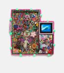 plastic, glass, metal, pine cone, porcelain, shells, printed fabric, synthetic fabric, synthetic cord, media player, LEDs, electrical components, synthetic polymer paint, enamel paint and resin on wood and composition board