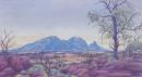 Painted at the height of the artist’s success, this work was completed on one of Albert Namatjira’s many painting trips across Aranda Country during the 1940s. Muted and atmospheric, this painting captures the evening light in a vista of recently burnt eucalyptus trees in the foreground. It is an excellent example of Namatjira’s recording of changes to his Country from environmental factors and First Nations land management practices.