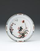 The imagery on this Venetian porcelain plate derives from Chinese blue-and white Kraak wares produced for export to Europe, yet the colour palette is Japanese and sits somewhere between the Kakiemon and imari palettes, imari decoration characterised by a more lavish use of gold.