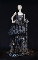 These couture gowns draw inspiration from the sacred native plants that are central to Miriwoong life and culture in the Kimberley, Western Australia. Peggy Griffiths’ Jilinybeng jardang draws upon the significance of the spinifex plant and the bush cucumber, recurring motifs in her work. Both plants are indicative of the wet season in the Kimberley, and Griffiths’ garment showcases how Country nurtures culture and Community, exemplified by the way the sculptural construction of the bush cucumber envelops the body of the wearer. Cathy Ward’s Gerdewoon is a celebration of the physical and spiritual nourishment of the sacred gerdewoon (boab tree). In the Kimberley’s arid climate, gerdewoon serve as both natural reservoirs, storing water within their thick trunks, and as gathering spaces for Ceremony and cultural practice.