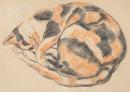 This study is modelled on Thea Proctor’s own sleeping cat. Probably the only time cats sit still long enough to be drawn in any detail is when they are asleep – moments countless artists have used to their advantage. No doubt this cat belonged to Proctor, as she named it Calico and numerous sketches by her of this beautiful cat exist. There is another drawing of Calico on the back of this sheet, which was probably removed from a sketchbook.
