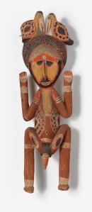Highly stylised carving in solid, large head, bent raised arms, bent open legs, no feet. The head dresses are of two birds in profile facing each other.