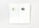 White acrylic square traversed by fine black broken line flanked by two silver hemispheres.