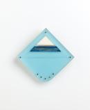 Square with one rounded corner, three sheets acrylic jointed together with silver pins, the middle layer with an arrangement of ivory segments and titanium bars.