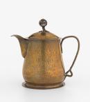 Tapered cylindrical body with flanged foot, short spout, 3-strand strap handle, domed cover