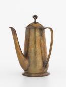 Tapered cylindrical body with flanged foot, long spout, 3-strand strap handle, domed cover