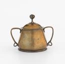 Tapered cylindrical body with flanged foot, pair of 3-strand strap handles, domed cover