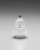Domed lid, everted rim and red gum finial on short stem: globular body vert. Sided neck, on circular footring.
