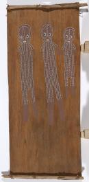 These bark paintings by Crusoe Kuningbal depict Mimih spirits, ancestral beings associated with rock art who are believed to have taught Kuninjku ancestors to paint on rock shelters. Rendered in dynamic poses, the figures echo the animated presence of their original forms. In the 1970s, Kuningbal pioneered the sculptural representation of Mimih spirits, creating works initially for the art market. His practice marked a significant shift, emerging at a moment when collecting institutions were beginning to actively acquire works by First Nations artists as contemporary cultural and artistic productions.