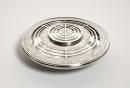 Bowl, on circular foot, has pierced cover decorated with stylized leaf and circle motifs in niello.