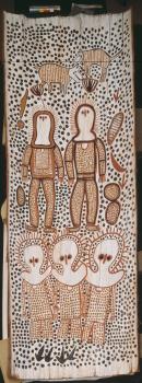 The two dingoes at the top derive from the dingoes at Baralamma Springs, Napier Range. The four round objects probably represent cheeky yam (kanin), while the elongated shape depicts the long yam, kanmangku.