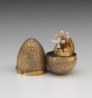 Egg containing bird hovering over foliage with stems ending in pearls.