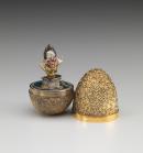 Egg containing jack-in-the-box, set on convex blue enamel box.