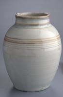 Pale grey glaze with slight variation in colour, decorated below the shoulder with three brown lines and three grey lines, decorated on the narrow cylindrical neck with brown, grey and blue (cobalt) lines, brown rim.