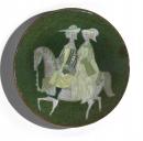 Straight sides rising from small foot, painted in white, green and yellow with two figures in medieval costume riding a horse, exterior with brown glaze