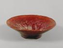 Hand built, sides slope steeply from small foot ring which has been cut into three small feet, interior with red and green lustre glazes, exterior dark blackish red, pal buff body.