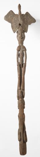 Post carved in high relief on all sides with two main vertical lines of figures, with human headed snakes and fish in between. On the front a crocodile below a large standing male figure surrounded by a large sea eagle, its feet on its head. On the reverse, a smaller male figure.