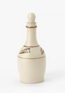 Oatmeal glaze with decoration of lines three 'ladder-like' ornaments in cobalt and blue. Neck of decanter broken.